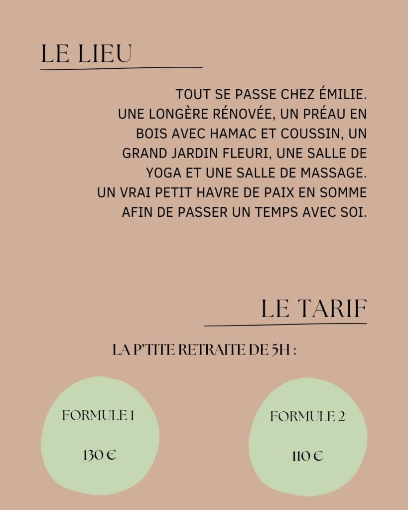 Formule escapade yoga + massage , avec 1 nuitée en petite roulotte : 130 euros, cette formule comprends une nuit pour 2 personnes en roulotte , un massage 1h pour une personne et un cour de yoga 1h pour une personne.