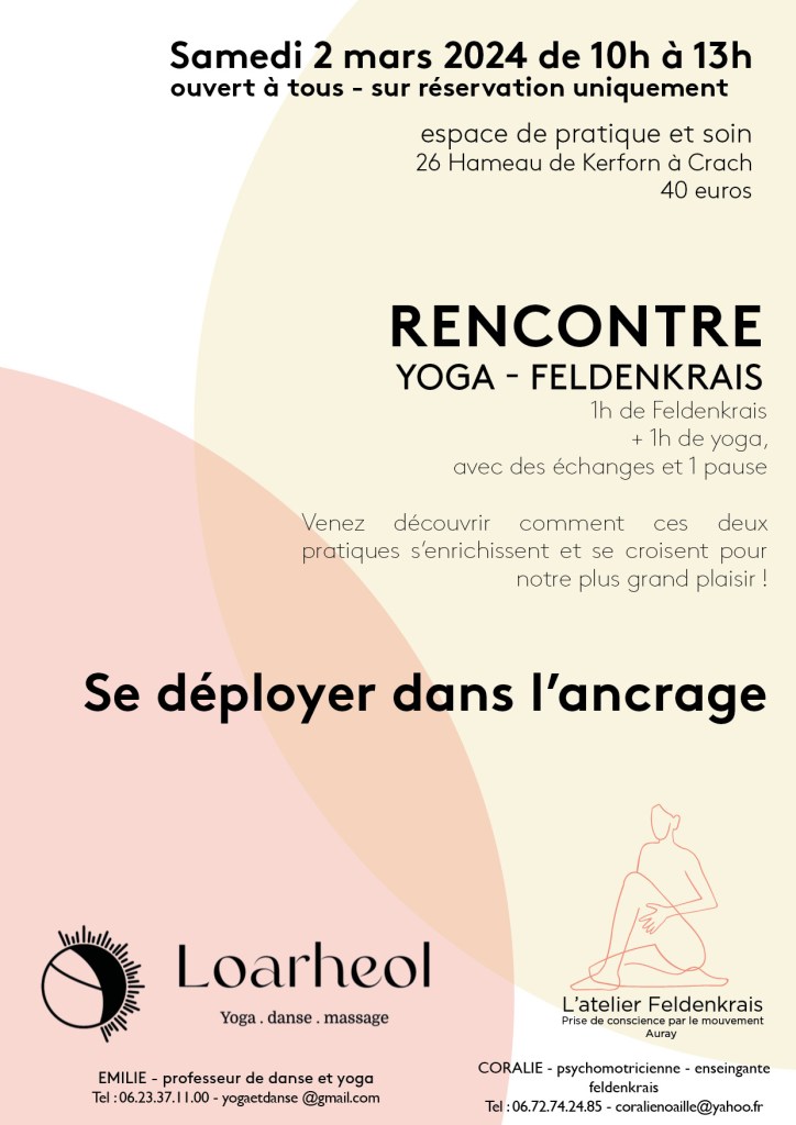 Nous nous sommes rencontrée , nous avons parlé, puis échangé nos pratiques et enfin rêvé de les faire se croiser au sein d’un stage commun, et bien c’est chose faite… C’est avec joie que je vous propose d’expérimenter la méthode Feldenkrais et le Hatha yoga, dans cette rencontre du samedi 2 mars de 10h à 13h issue de la belle collaboration avec Coralie, psychomotricienne et enseignante Feldenkrais.
